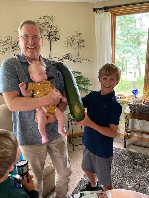 Eli is showing how gigantic Papa's zucchini grew! It was as long as Theo!